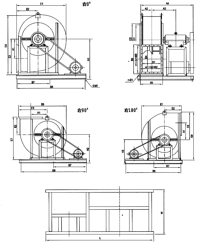 風機分左旋和右旋兩種型式,從電機(皮帶輪)側(cè)正視,葉輪按順時針方向旋轉(zhuǎn)為右旋,逆時針旋轉(zhuǎn)為左旋。A式為電機直聯(lián)傳動, B、C、E式為皮帶傳動,D、F式為聯(lián)軸器傳動。